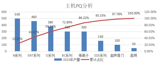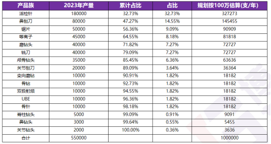 根據(jù)工廠的產(chǎn)品的產(chǎn)品族分析,工廠活檢針類產(chǎn)品的銷量占產(chǎn)品的32.7%,為一次性耗材第一,活檢針,鼻刨刀,鋸片,等離子,磨鉆頭,銑刀,顱骨鉆頭量占比總量的85.5%。