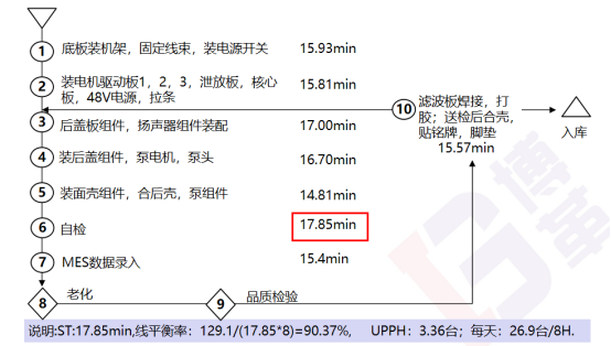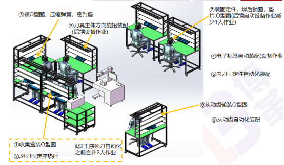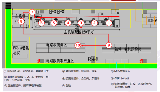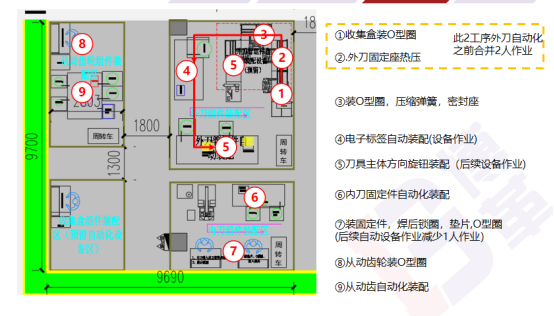 通過(guò)連續(xù)流布局,配配用設(shè)備嵌入生產(chǎn)線,減少生產(chǎn)斷點(diǎn)與搬運(yùn),斷點(diǎn)由12降到3個(gè),生產(chǎn)過(guò)程搬運(yùn)距離由860米降到60m