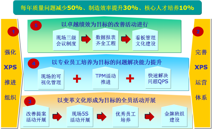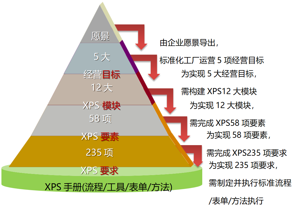 XPS系統(tǒng)架構(gòu)分由理念、原則、模型、目標、要素、要求部分構(gòu)成,其理念為:“XPS-A持續(xù)變革系統(tǒng)”是以A集團及下屬企業(yè)戰(zhàn)略為導向,結(jié)合企業(yè)運營的具體情況,運用世界上最行之有效的績效改善工具和方法,幫助企業(yè)建立和完善高效的運營系統(tǒng)和模式-XPS持續(xù)變革系統(tǒng),使企業(yè)在產(chǎn)品創(chuàng)新、流程創(chuàng)新、人才培養(yǎng)、利潤創(chuàng)新等方面的績效達到世界領(lǐng)先水平,并形成與企業(yè)自身文化相融合的持續(xù)改善文化,構(gòu)筑企業(yè)的核心競爭力。“